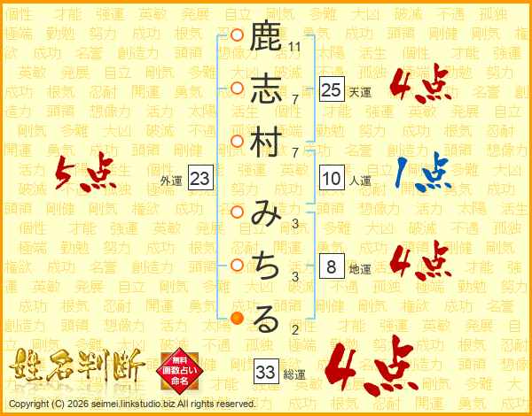 鹿志村みちるさんの総運は33画の4点!