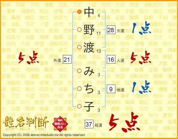 中野渡みち子さんの総運は37画の5点!
