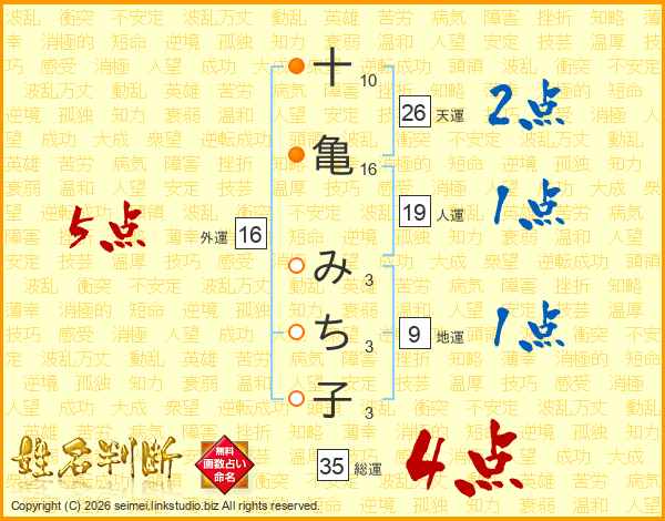 十(10画)亀(16画) み(3画)ち(3画)子(3画)