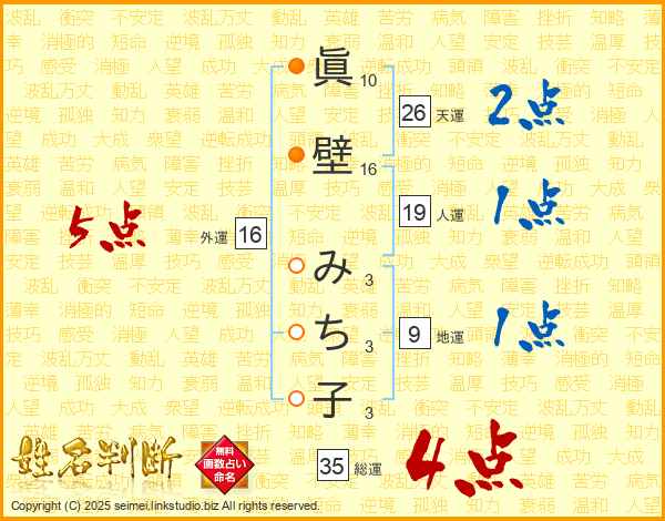 眞(10画)壁(16画) み(3画)ち(3画)子(3画)
