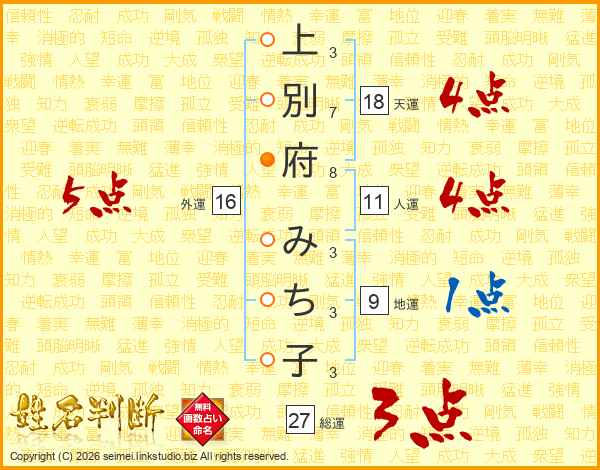 上(3画)別(7画)府(8画) み(3画)ち(3画)子(3画)