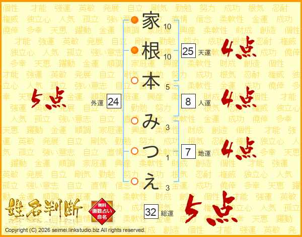 家(10画)根(10画)本(5画) み(3画)つ(1画)え(3画)
