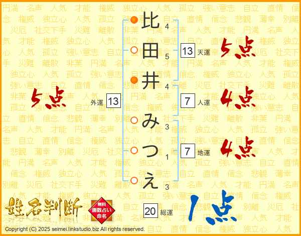 生活面を象徴する運勢です。外部から受ける影響力を表し、結婚運、家庭運や職場、環境への順応性を表します。総運から人運を引いた画数。姓や名が1文字の場合を除く。