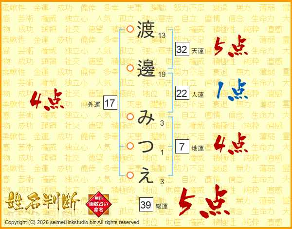 渡(13画)邊(19画) み(3画)つ(1画)え(3画)