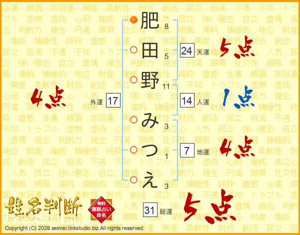 肥田野みつえさんの総運は31画の5点!