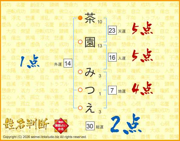 茶(10画)園(13画) み(3画)つ(1画)え(3画)
