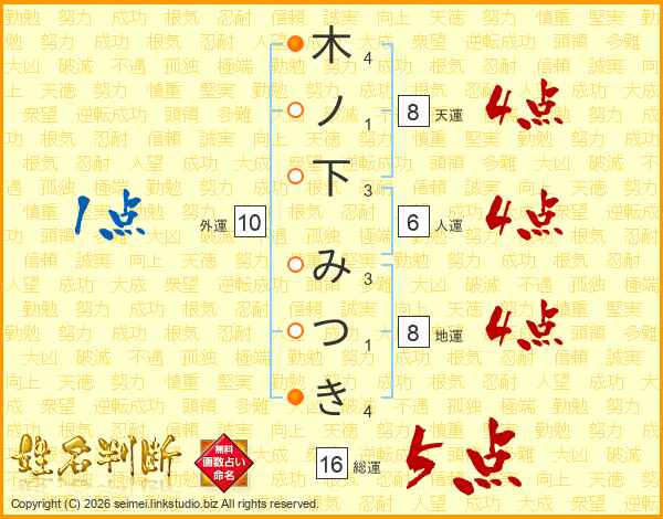 木ノ下みつきさんの総運は16画の5点!
