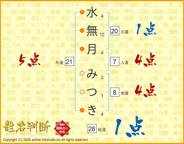 水(4画)無(12画)月(4画) み(3画)つ(1画)き(4画)