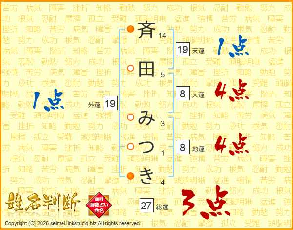 斉田みつきさんの総運は27画の3点!