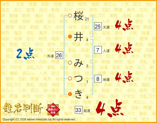 桜井みつきさんの総運は33画の4点!