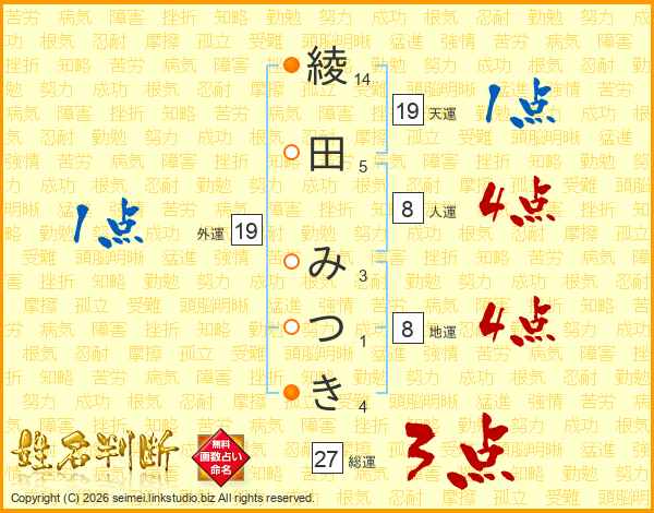 綾(14画)田(5画) み(3画)つ(1画)き(4画)