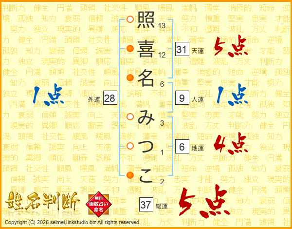 照(13画)喜(12画)名(6画) み(3画)つ(1画)こ(2画)