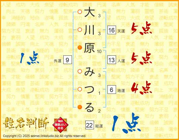 生活面を象徴する運勢です。外部から受ける影響力を表し、結婚運、家庭運や職場、環境への順応性を表します。総運から人運を引いた画数。姓や名が1文字の場合を除く。