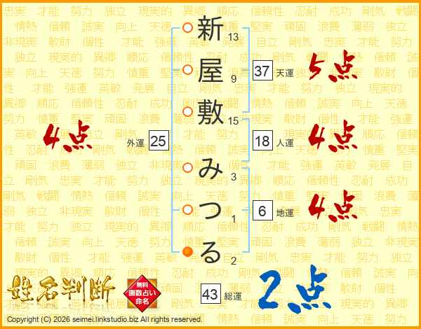 新屋敷みつるさんの天運は37画の5点!
