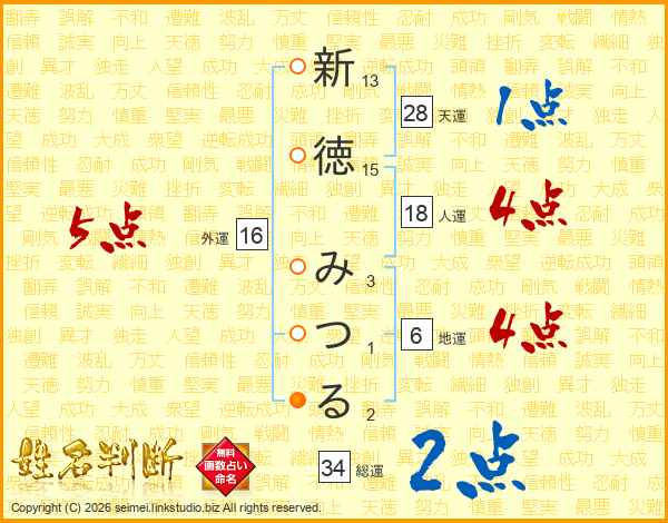新(13画)徳(15画) み(3画)つ(1画)る(2画)
