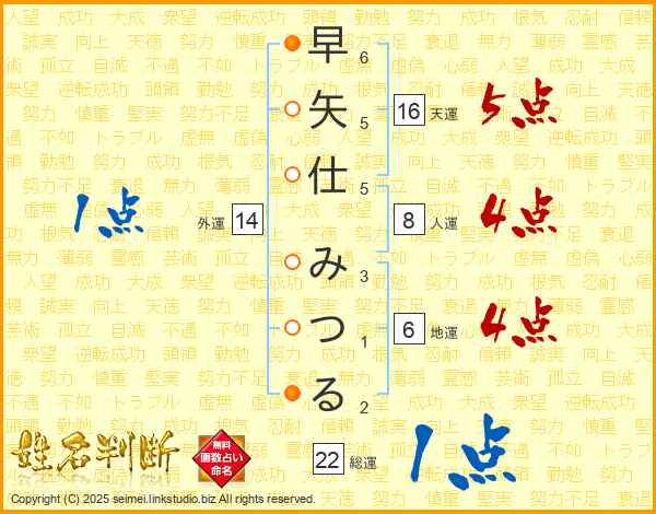 早(6画)矢(5画)仕(5画) み(3画)つ(1画)る(2画)