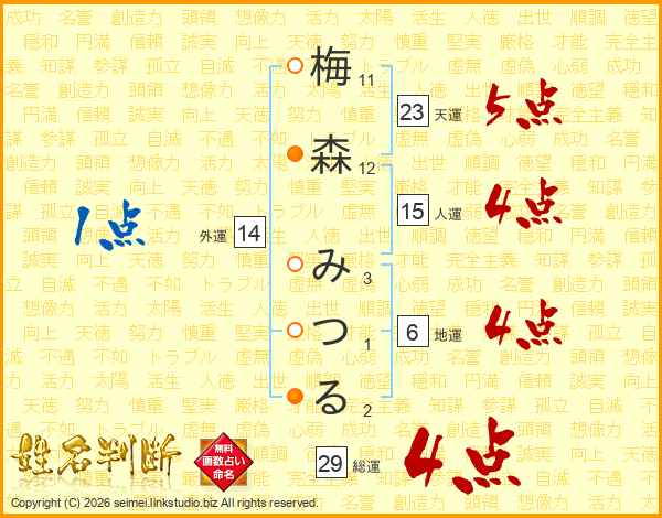 梅(11画)森(12画) み(3画)つ(1画)る(2画)