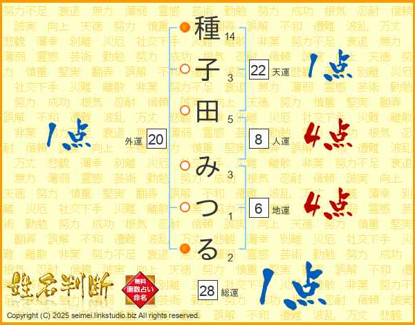 種(14画)子(3画)田(5画) み(3画)つ(1画)る(2画)