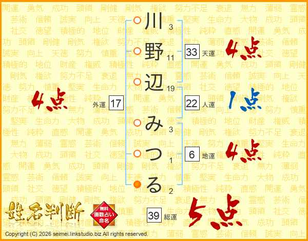 川野辺みつるさんの天運は33画の4点!