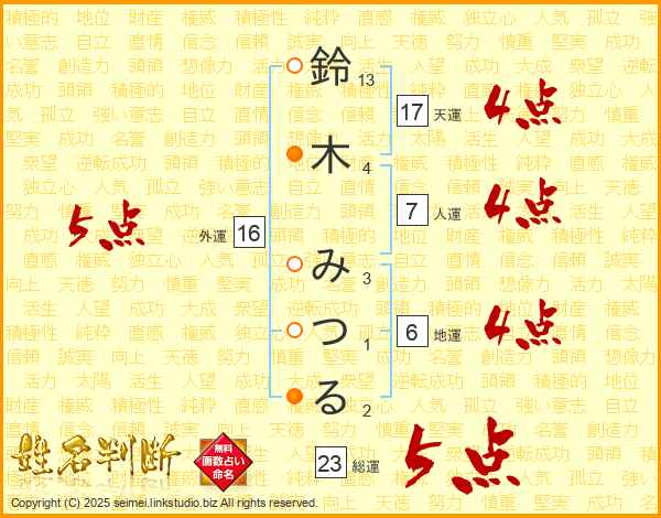 鈴(13画)木(4画) み(3画)つ(1画)る(2画)