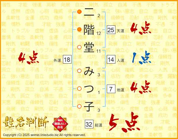 生活面を象徴する運勢です。外部から受ける影響力を表し、結婚運、家庭運や職場、環境への順応性を表します。総運から人運を引いた画数。姓や名が1文字の場合を除く。