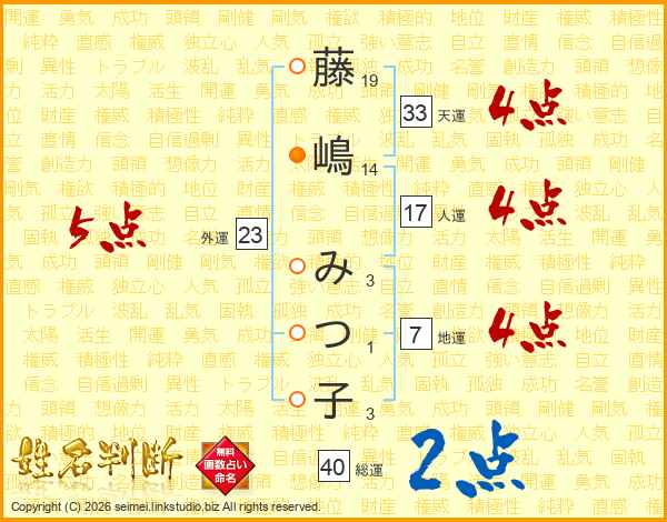 藤(19画)嶋(14画) み(3画)つ(1画)子(3画)