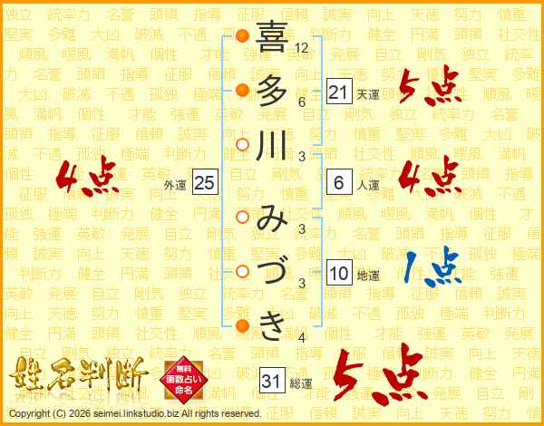 喜(12画)多(6画)川(3画) み(3画)づ(3画)き(4画)
