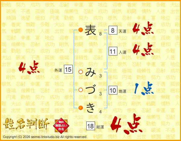 家系が持つ宿命的な運勢を表します。祖先から受け継いだ苗字ですので自分の力が及びません。家柄を象徴します。苗字の合計画数。