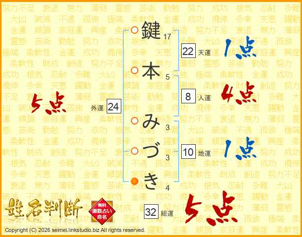 鍵(17画)本(5画) み(3画)づ(3画)き(4画)