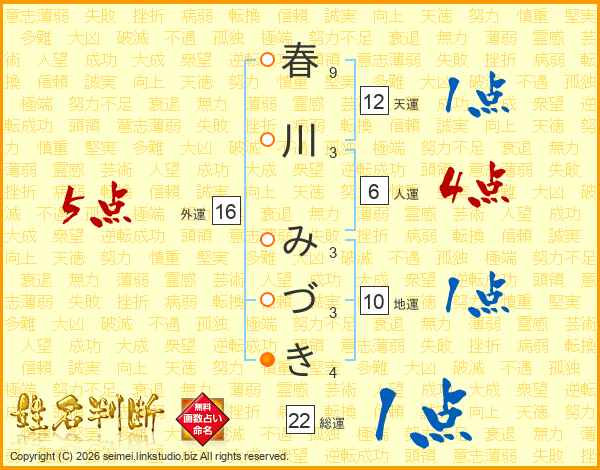 春川みづきさんの総運は22画の1点!