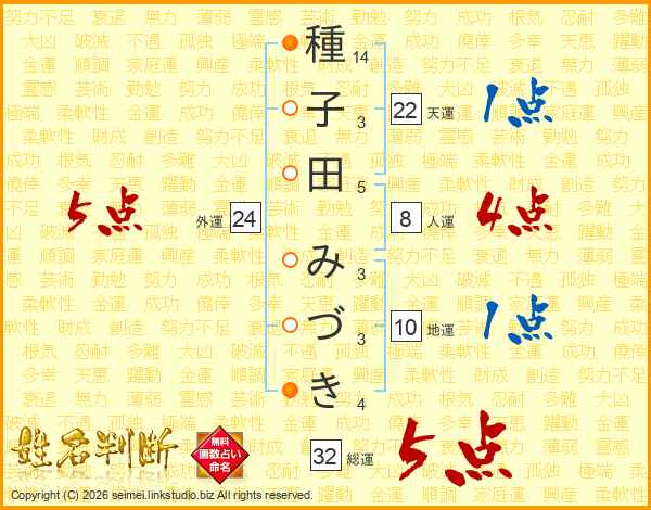 種(14画)子(3画)田(5画) み(3画)づ(3画)き(4画)
