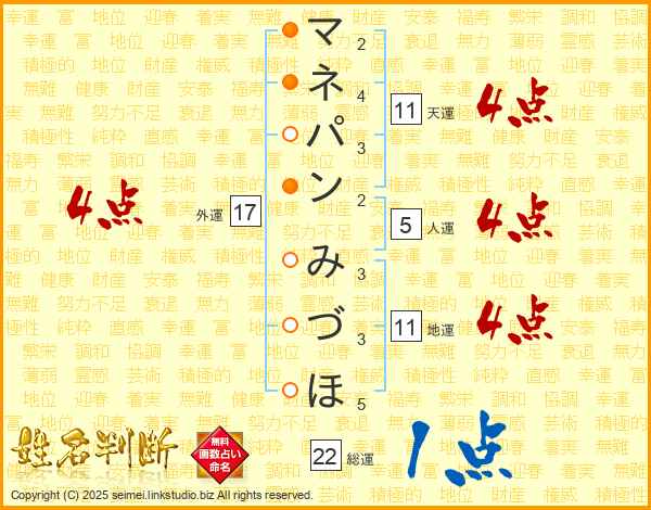 マ(2画)ネ(4画)パ(3画)ン(2画) み(3画)づ(3画)ほ(5画)