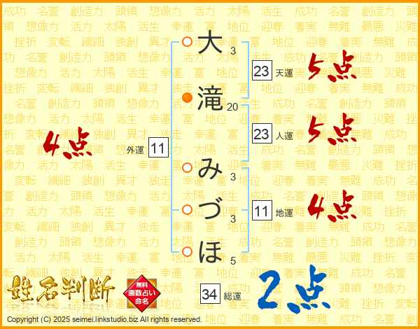 大(3画)滝(20画) み(3画)づ(3画)ほ(5画)