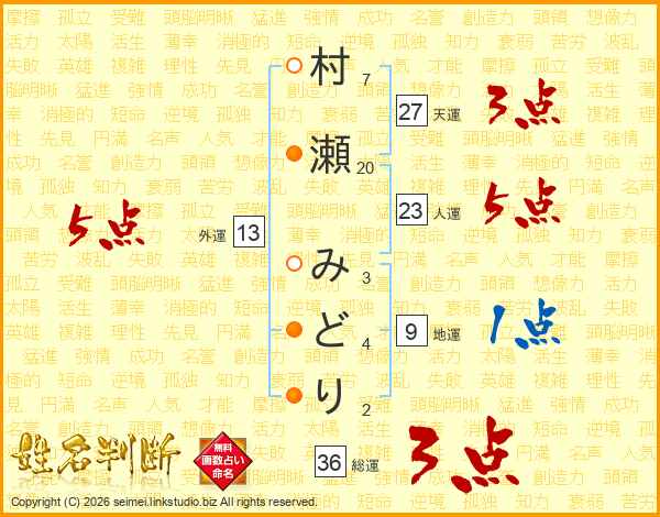 村(7画)瀬(20画) み(3画)ど(4画)り(2画)