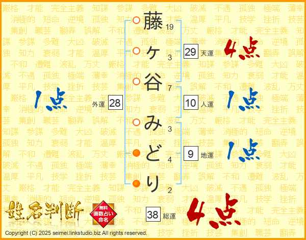 藤(19画)ヶ(3画)谷(7画) み(3画)ど(4画)り(2画)