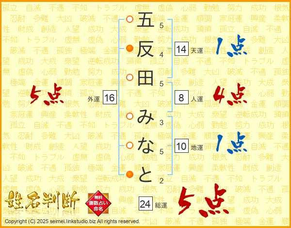 生活面を象徴する運勢です。外部から受ける影響力を表し、結婚運、家庭運や職場、環境への順応性を表します。総運から人運を引いた画数。姓や名が1文字の場合を除く。