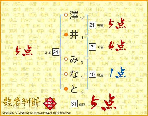 澤(17画)井(4画) み(3画)な(5画)と(2画)