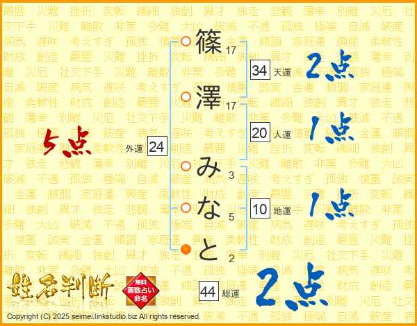生活面を象徴する運勢です。外部から受ける影響力を表し、結婚運、家庭運や職場、環境への順応性を表します。総運から人運を引いた画数。姓や名が1文字の場合を除く。
