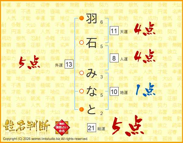 羽(6画)石(5画) み(3画)な(5画)と(2画)