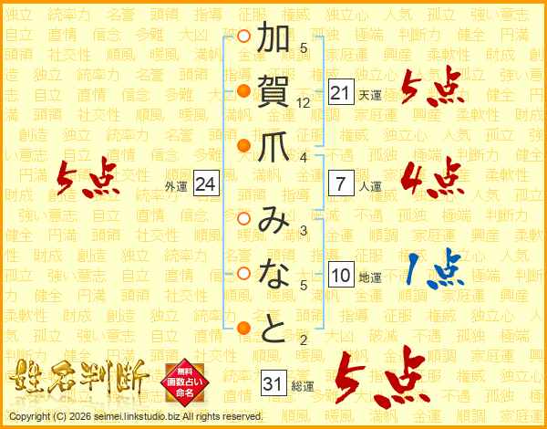加(5画)賀(12画)爪(4画) み(3画)な(5画)と(2画)