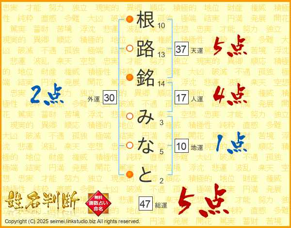 根(10画)路(13画)銘(14画) み(3画)な(5画)と(2画)