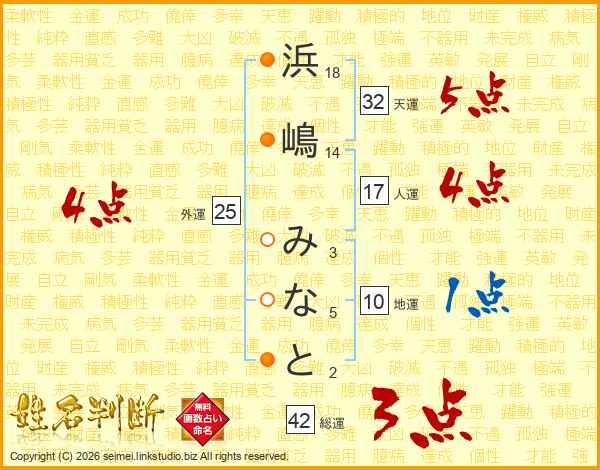 浜(18画)嶋(14画) み(3画)な(5画)と(2画)