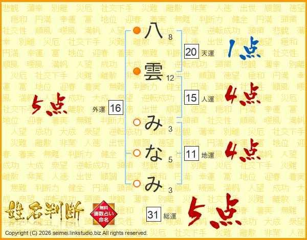八雲みなみさんの総運は31画の5点!