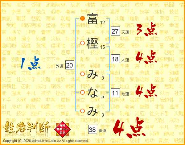 富(12画)樫(15画) み(3画)な(5画)み(3画)