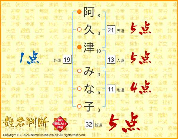阿(8画)久(3画)津(10画) み(3画)な(5画)子(3画)