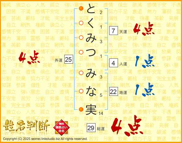生活面を象徴する運勢です。外部から受ける影響力を表し、結婚運、家庭運や職場、環境への順応性を表します。総運から人運を引いた画数。姓や名が1文字の場合を除く。
