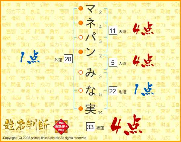 マ(2画)ネ(4画)パ(3画)ン(2画) み(3画)な(5画)実(14画)
