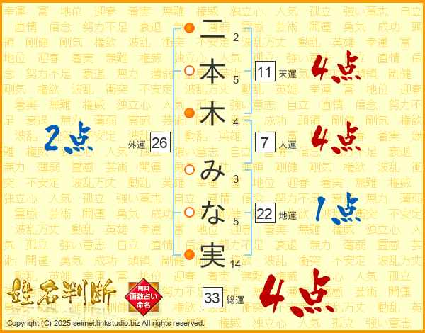 生活面を象徴する運勢です。外部から受ける影響力を表し、結婚運、家庭運や職場、環境への順応性を表します。総運から人運を引いた画数。姓や名が1文字の場合を除く。