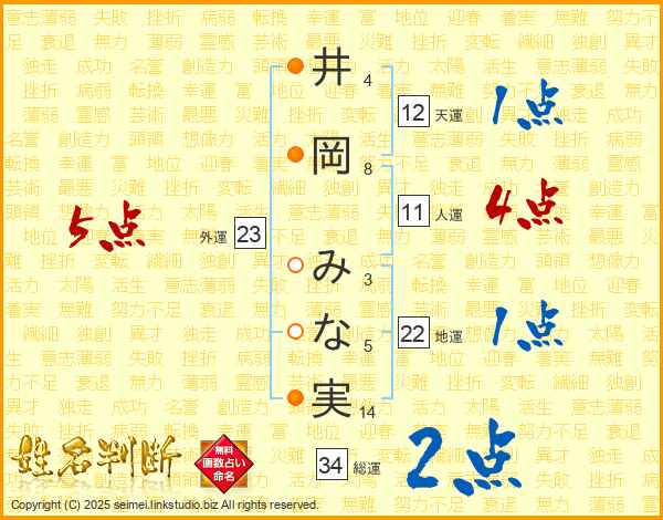 井(4画)岡(8画) み(3画)な(5画)実(14画)