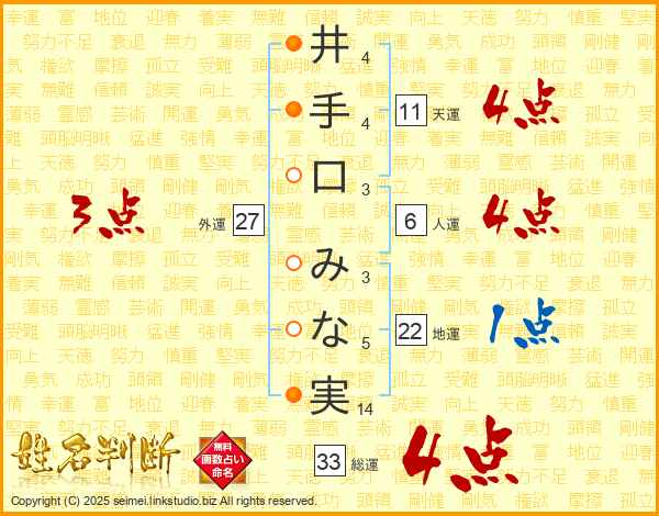井(4画)手(4画)口(3画) み(3画)な(5画)実(14画)